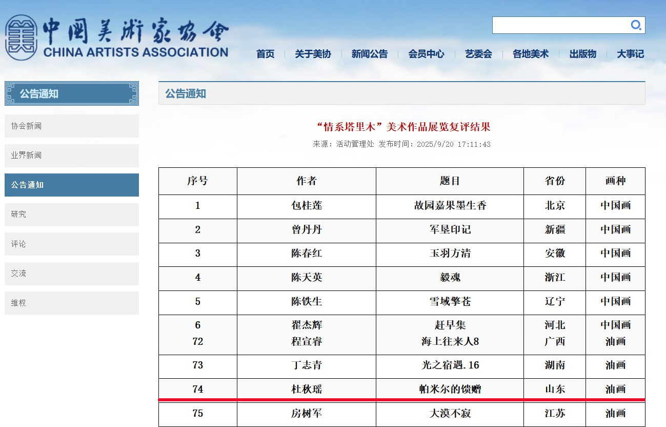 9月20日,由中国美术家协会官网公布的复评结果获悉,我校伟德bv1946官网伟德bv1946官网综合材料绘画工作室学生杜秋瑶的油画作品(指导老师柳红波),成功入选“情系塔里木”全国美术作品展览,实现了我院本科生在中国美术家协会主办的全国大展中的新突破。