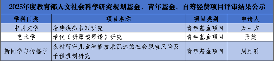 9月25日,教育部社科司公示了2025年度教育部人文社会科学研究一般项目评审结果。我部三项课题成功获批:文学院万一方老师申报的《唐诗疾病书写研究》、音乐学院张健老师申报的《清代〈研露楼琴谱〉研究》、传媒学院周红莉老师申报的《农村留守儿童智能技术沉迷的社会脱轨风险及干预机制研究》。